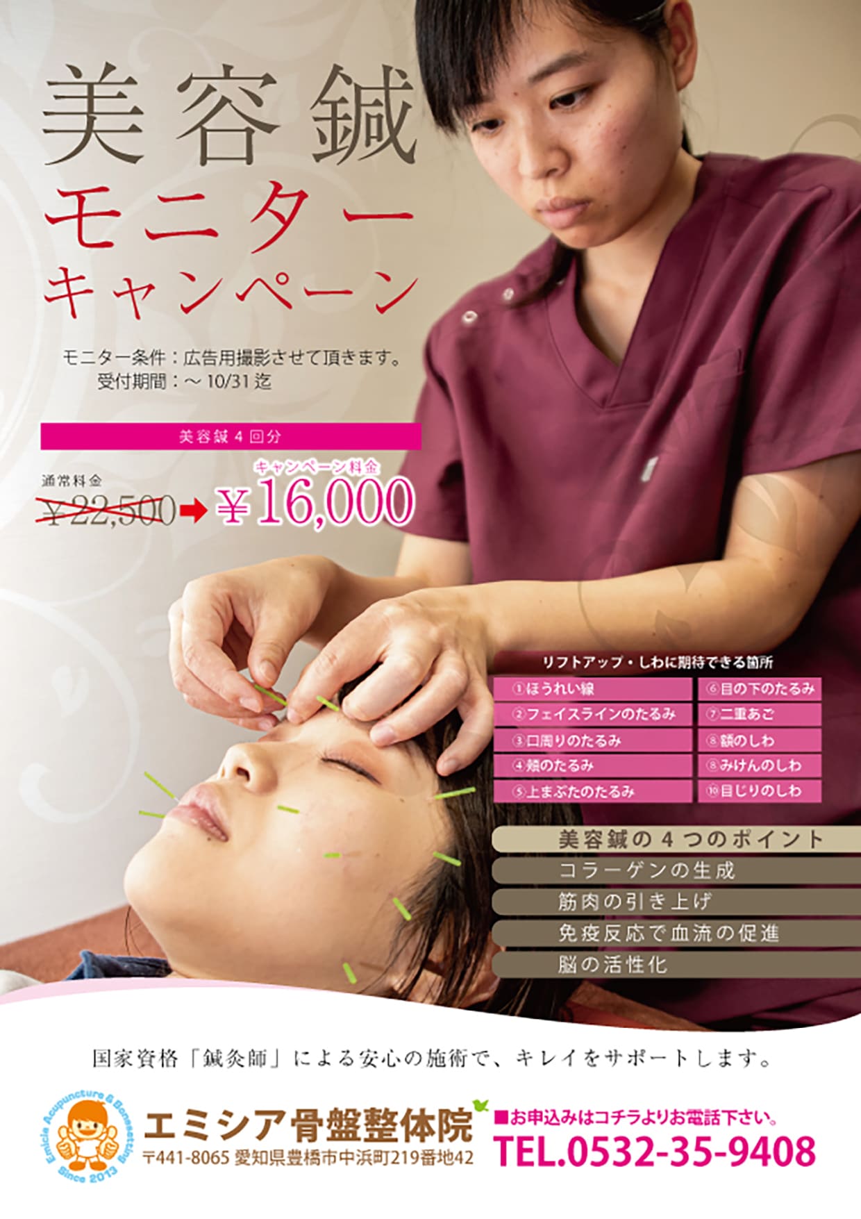 キャンペーンのご利用をご希望の方は、お電話にて「美容鍼モニターキャンペーン希望」とお伝えください。