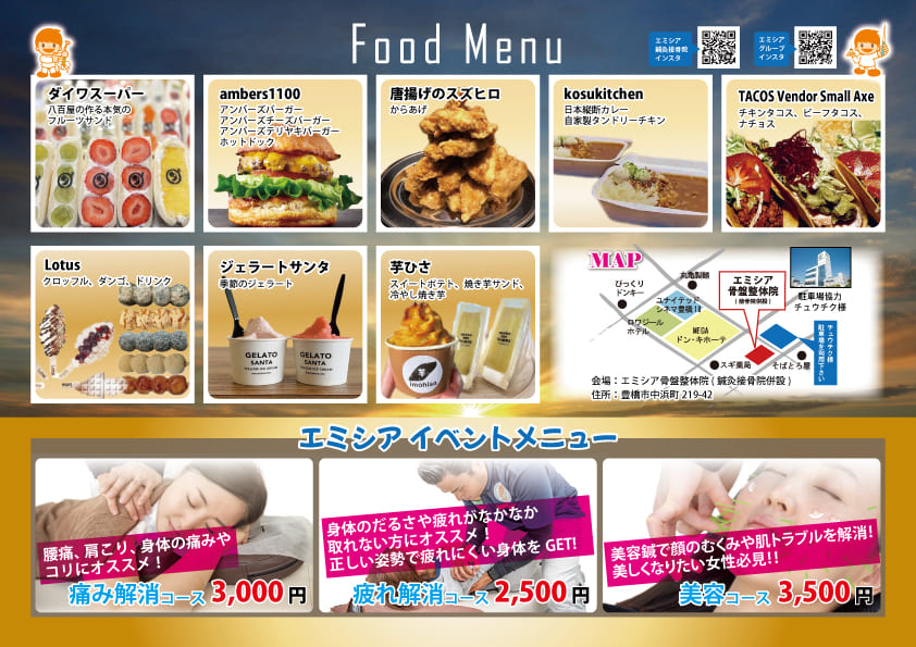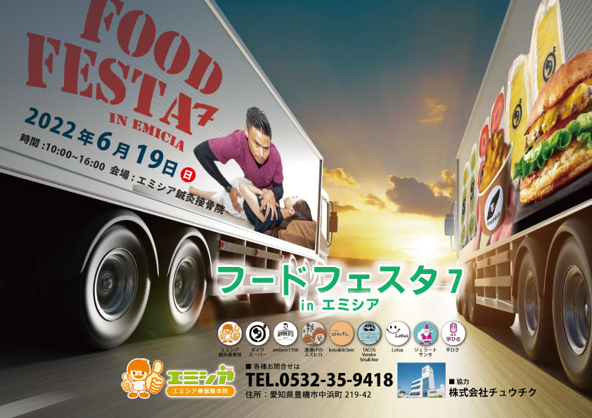 皆様お待たせ致しました。 「フードフェス7 in エミシア」を開催致します。 キッチンカーがエミシア鍼灸接骨院に大集合します! エミシアでは ・「痛み解消コース」治療機器&矯正、鍼、リラックスほぐし 3,000円 ・「疲れ解消コース」リラックスほぐし、姿勢矯正 2,500円 ・「美容コース」美容鍼、首リンパ流し 3,500円 にて施術致します。 身体を癒して、美味しい物を食べに是非ご来場ください。 日時:20226月19日(日) 10:00~16:00 場所:エミシア鍼灸接骨院駐車場 (豊橋市中浜町219-42 豊橋メガドン・キホーテ隣)