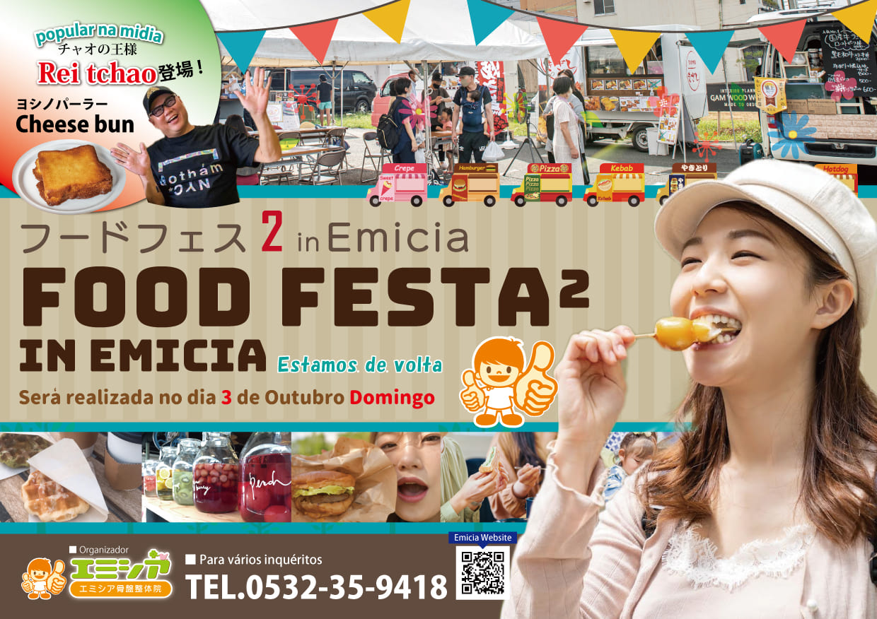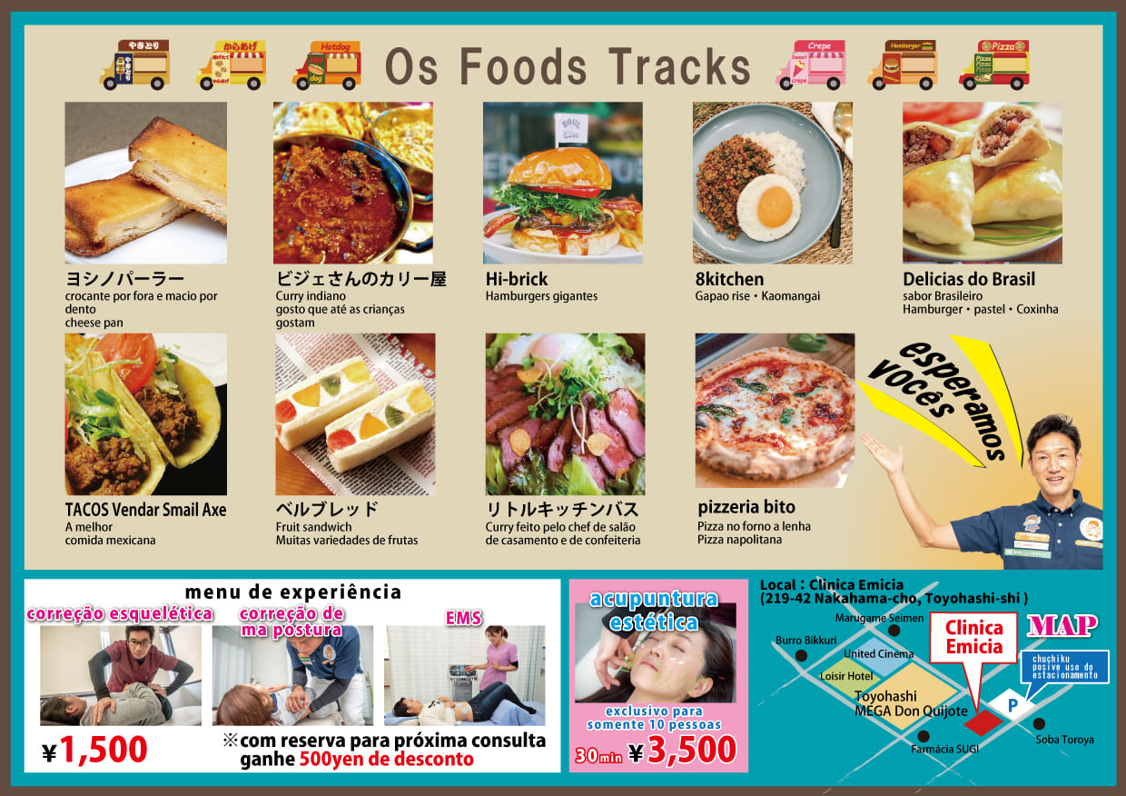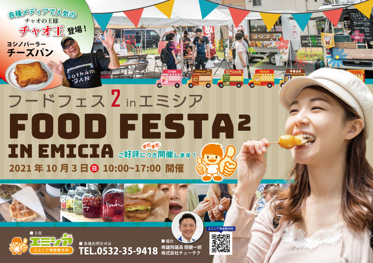 「第1回フードフェスinエミシア」ご好評につき 「第2回フードフェスinエミシア」を開催致します。   キッチンカーがエミシア鍼灸接骨院に大集合します! エミシアでは ・「骨格矯正・鍼灸施術」1,500円、次回予約で500円OFF ・「美容鍼」3,500円 限定10名様 にて施術致します。 美味しい物を食べに、是非ご来場ください。   日時:2021年10月3日 10:00~17:00 場所:エミシア鍼灸接骨院駐車場(豊橋市中浜町219-42 豊橋メガドン・キホーテ隣)