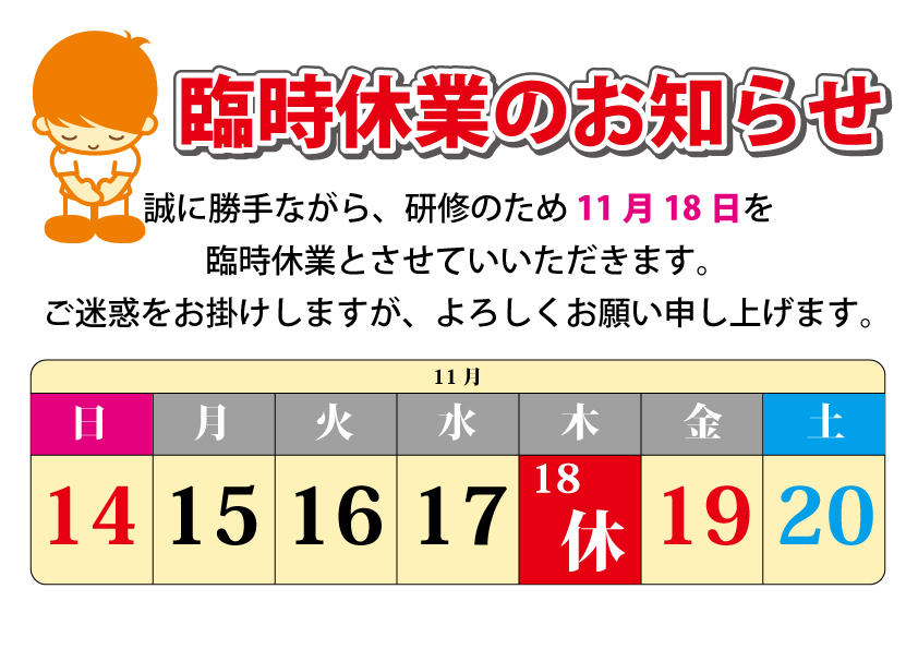 【臨時休業のおしらせ】 11月18日(木) 終日 スタッフ研修の為、臨時休業とさせて頂きます。