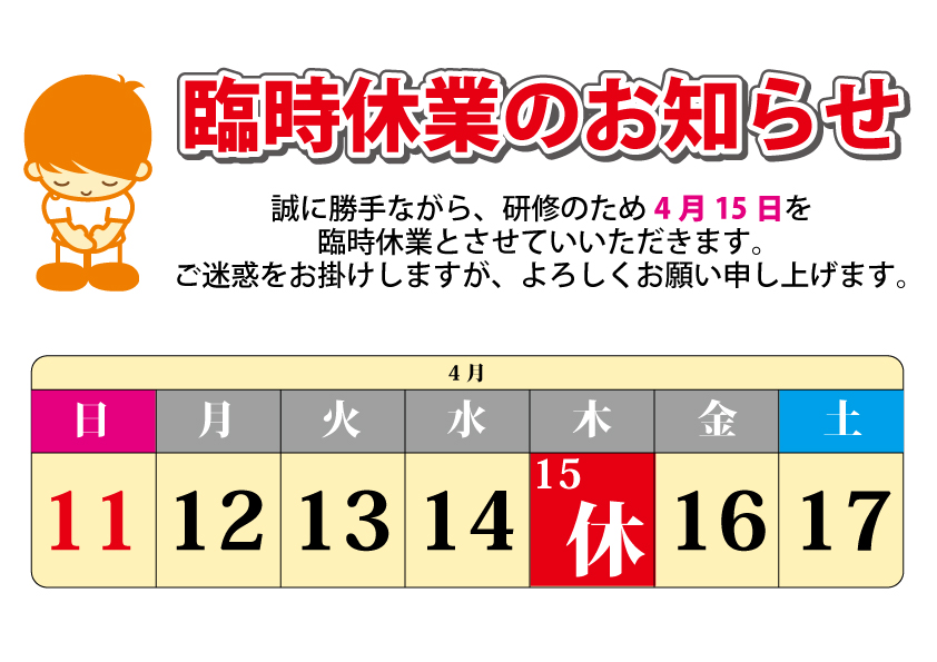 スタッフ研修の為、臨時休業とさせて頂きます。