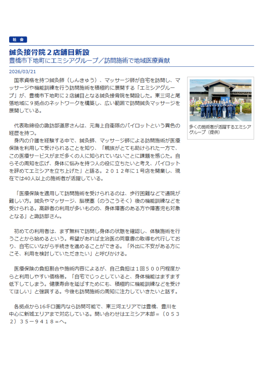 【新聞掲載】豊橋市下地町のエミシアグループ|訪問鍼灸マッサージと鍼灸接骨院の取り組み